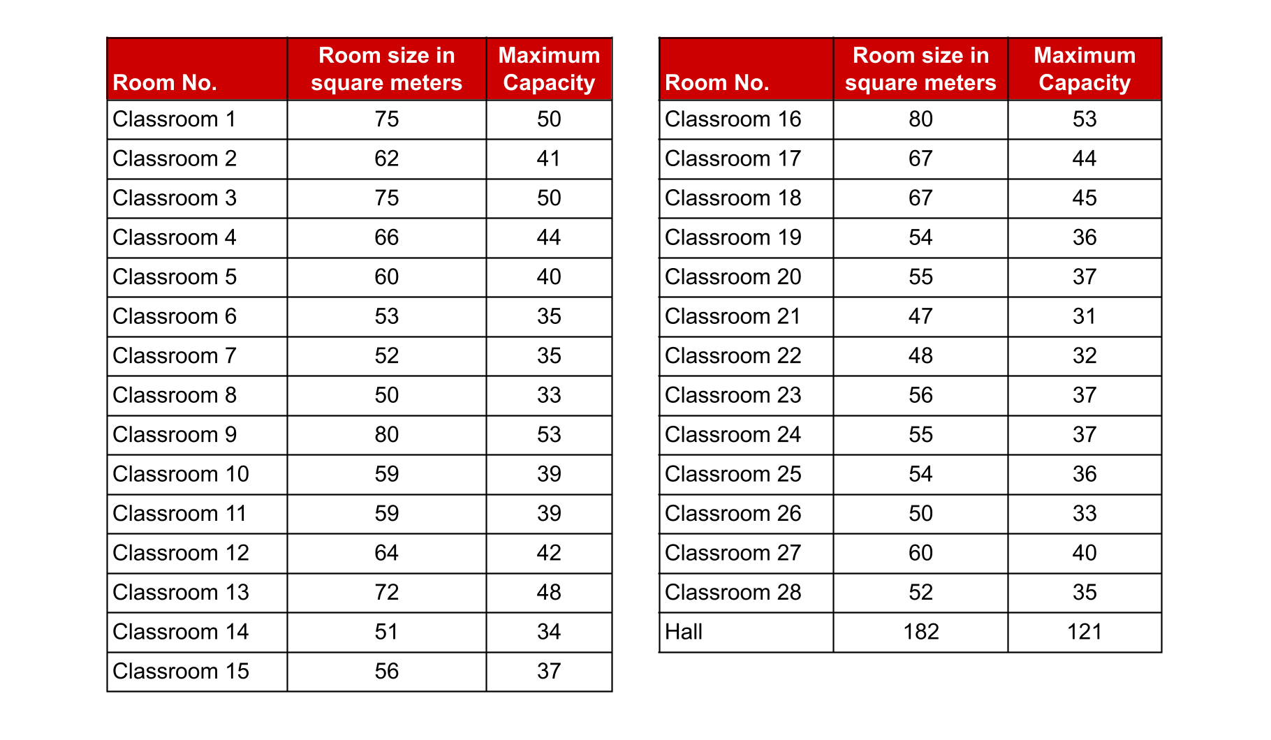 We aim to keep each class size to 28 students or under. The size and capacity of each of our classrooms are set out below as is required by SSG.